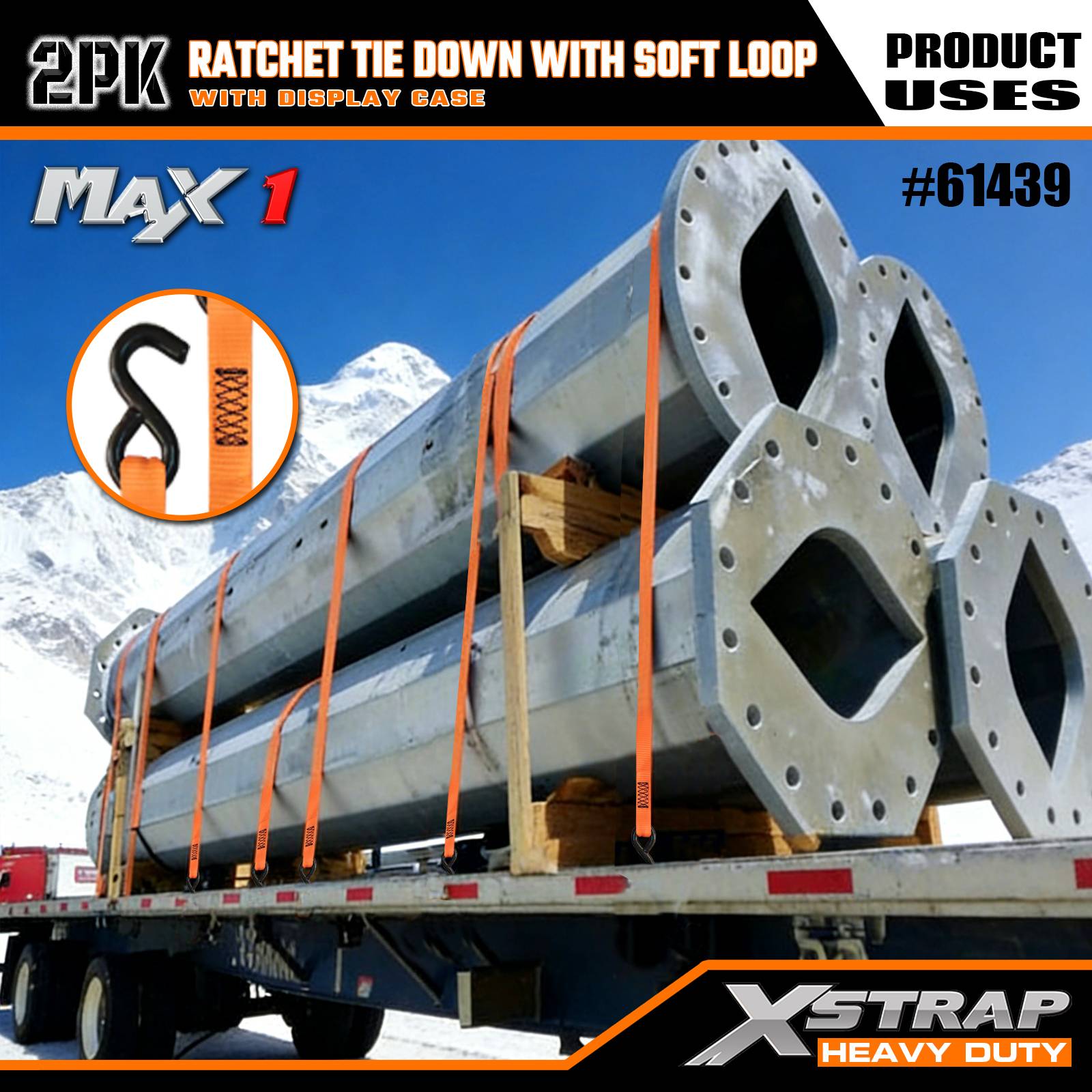 1-1/16インチ x 10フィート 2PK ラチェットタイダウンストラップ ソフトループ付き