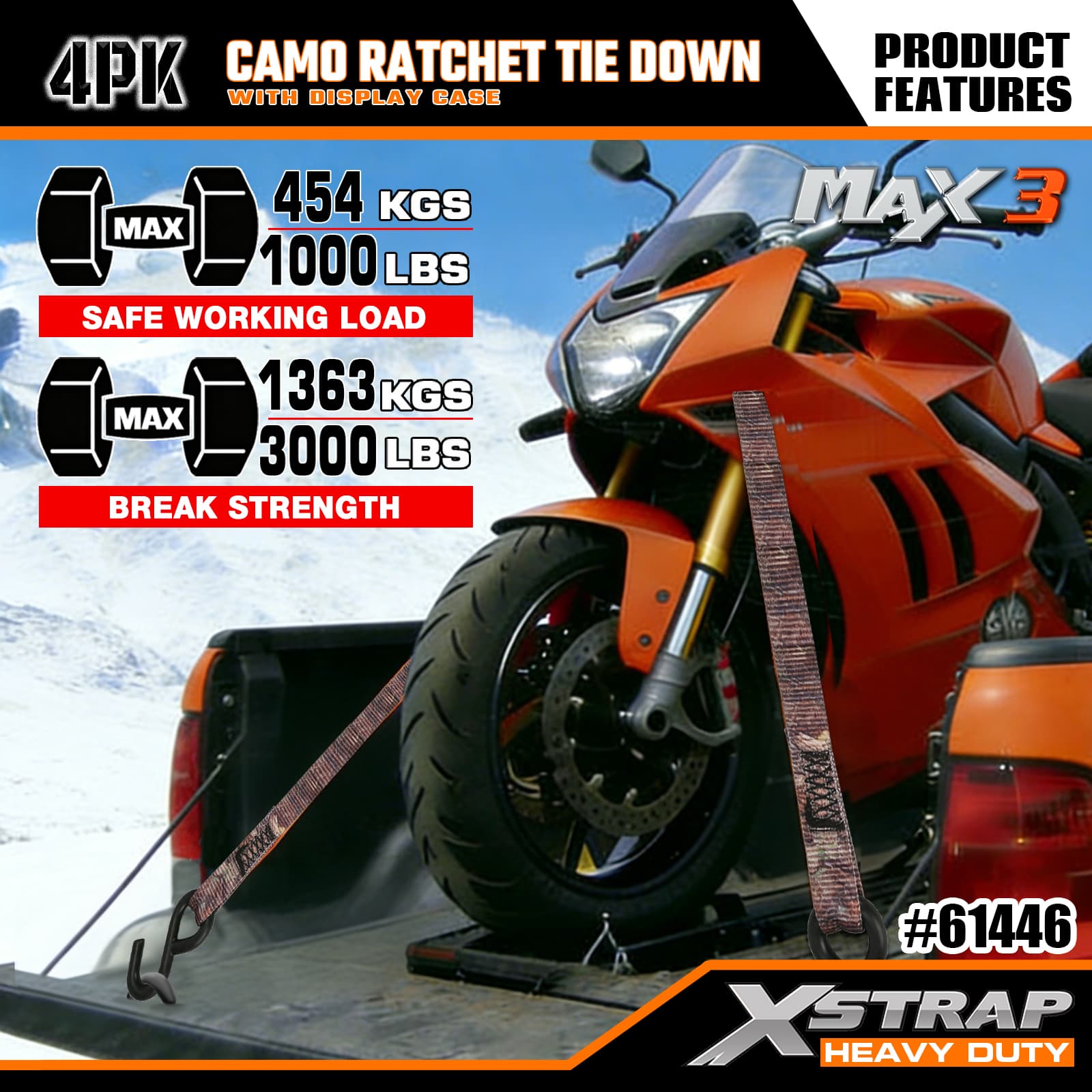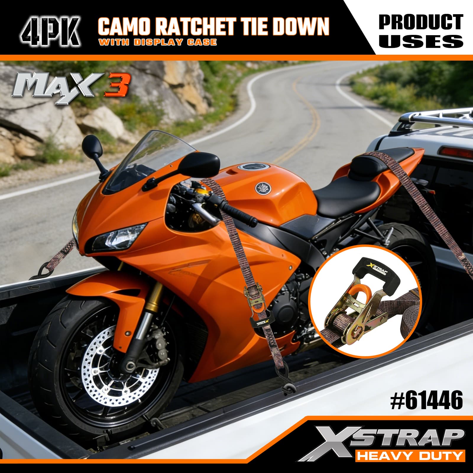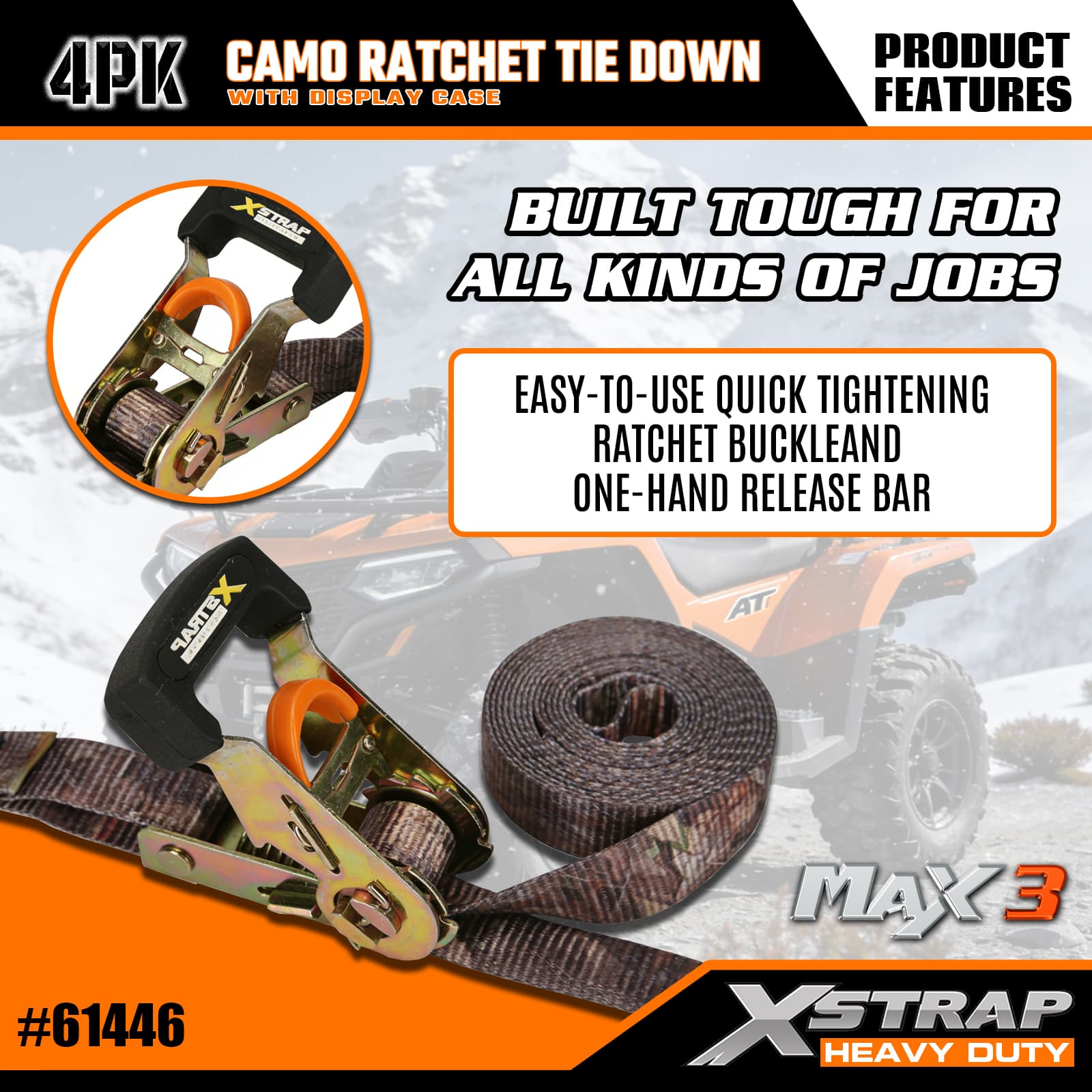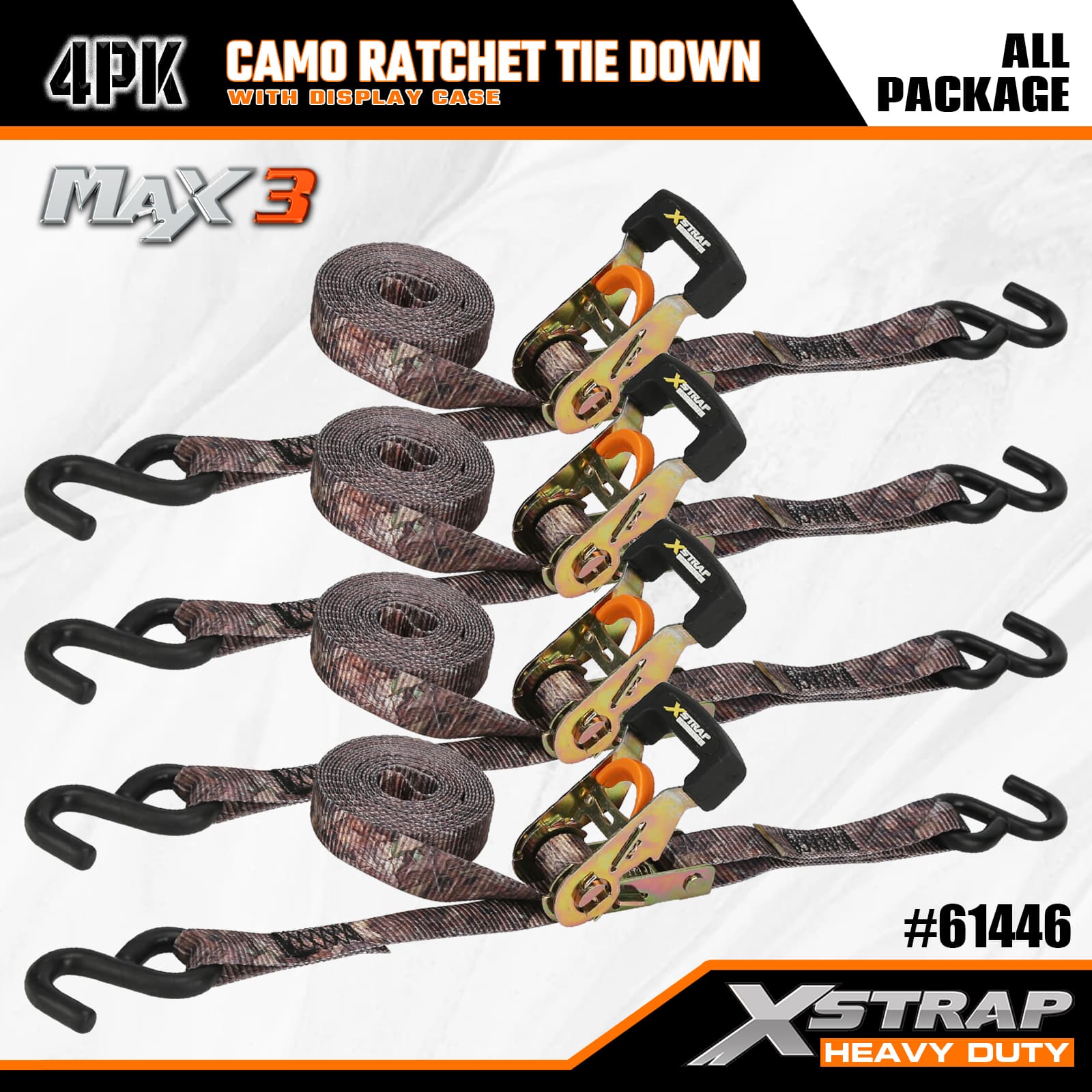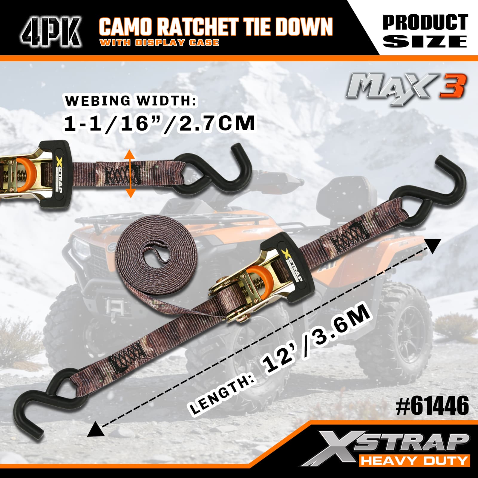Xstrap カモラチェットタイダウン 4 個パック、1-1/16 インチ x 12 フィート ポリエステルタイダウンストラップ プルラチェットストラップ、S フック付き耐荷重 1000 ポンドのカーゴラッシング固定ストラップ、ピックアップトラック、SUV、カートップラックオートバイ、軽漁船、ジェットスキー、スノーモービル、芝生トラクター用。