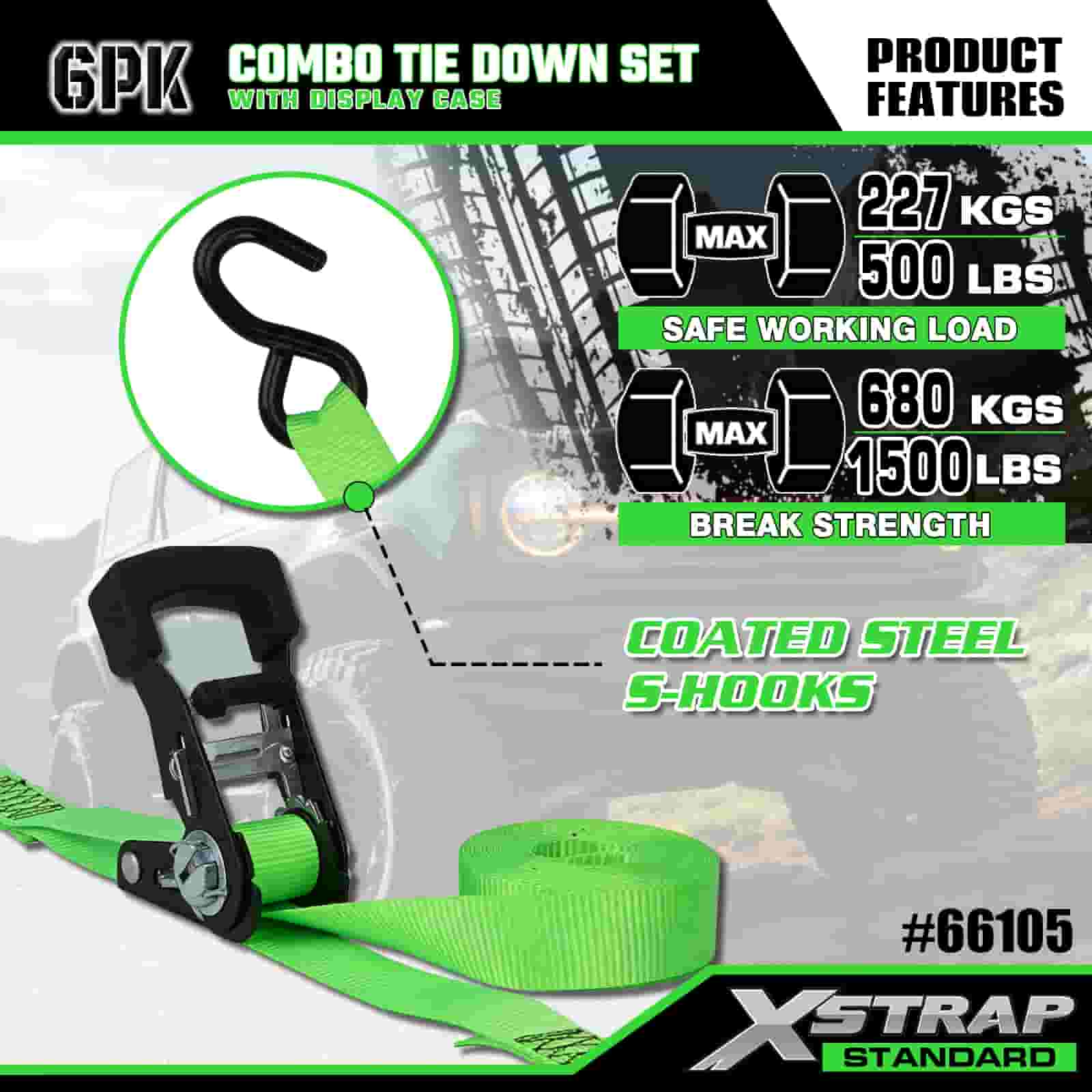 Xstrap 6 パック アルミニウム ラチェット タイダウン、1 インチ x 14 フィートおよび 1 インチ x 10 フィートのポリエステル タイダウン ストラップ プル ラチェット ストラップ、500 ポンドおよび 1100 ポンドの耐荷重 S フック付きカーゴ ラッシング固定ストラップ、カーゴ コントロール ピックアップ トラック、SUV、カー トップ ラック オートバイ用。