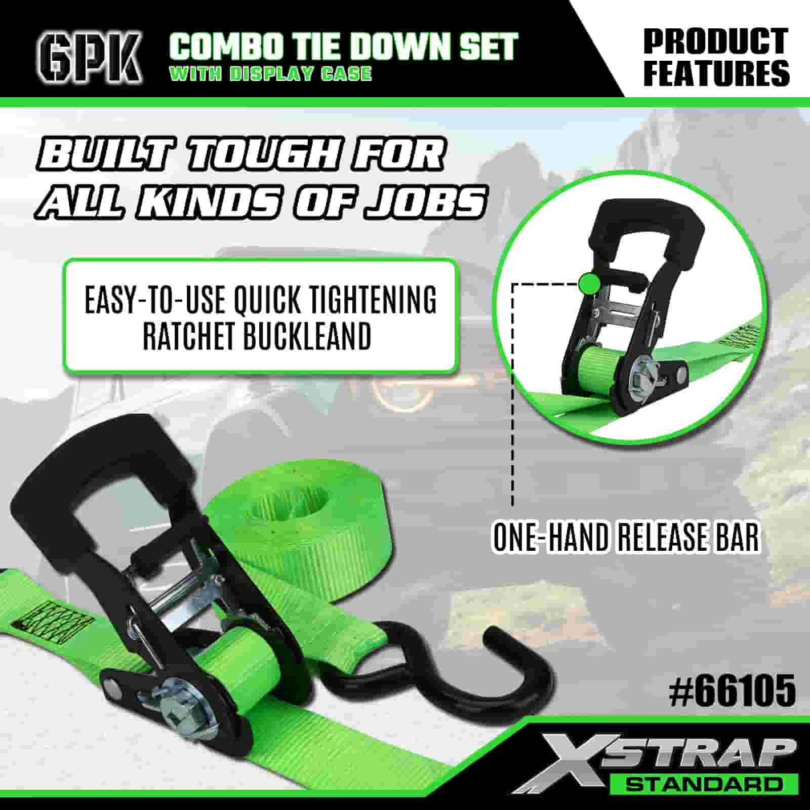 - 整理されたコンボディスプレイパッケージ: 4 つの軽量の緑色のタイダウンと 2 つの頑丈なオレンジのタイダウンに分かれた、きちんとしたラベル付きのディスプレイケースに入っており、保管、輸送、各作業に適したストラップの簡単な選択のためにセットを整頓しておくことができます。