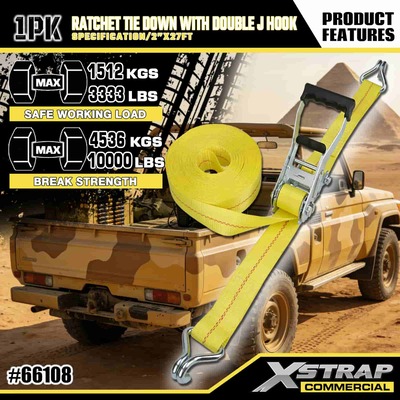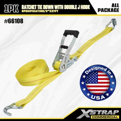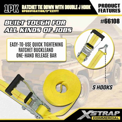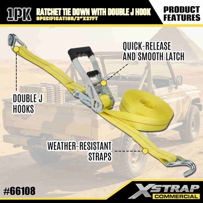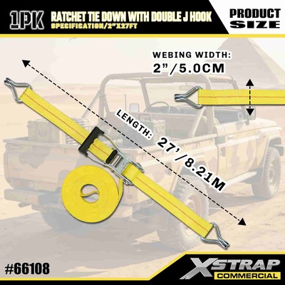Xstrap ラチェット タイダウン ダブル J フック付き、2 インチ x 27 フィート ポリエステル タイダウン ストラップ プル ラチェット ストラップ、耐荷重 3333 ポンドのカーゴ ラッシング固定ストラップ ダブル J フック付き、カーゴ コントロール ピックアップ トラック、SUV、カー トップ ラック オートバイ用。