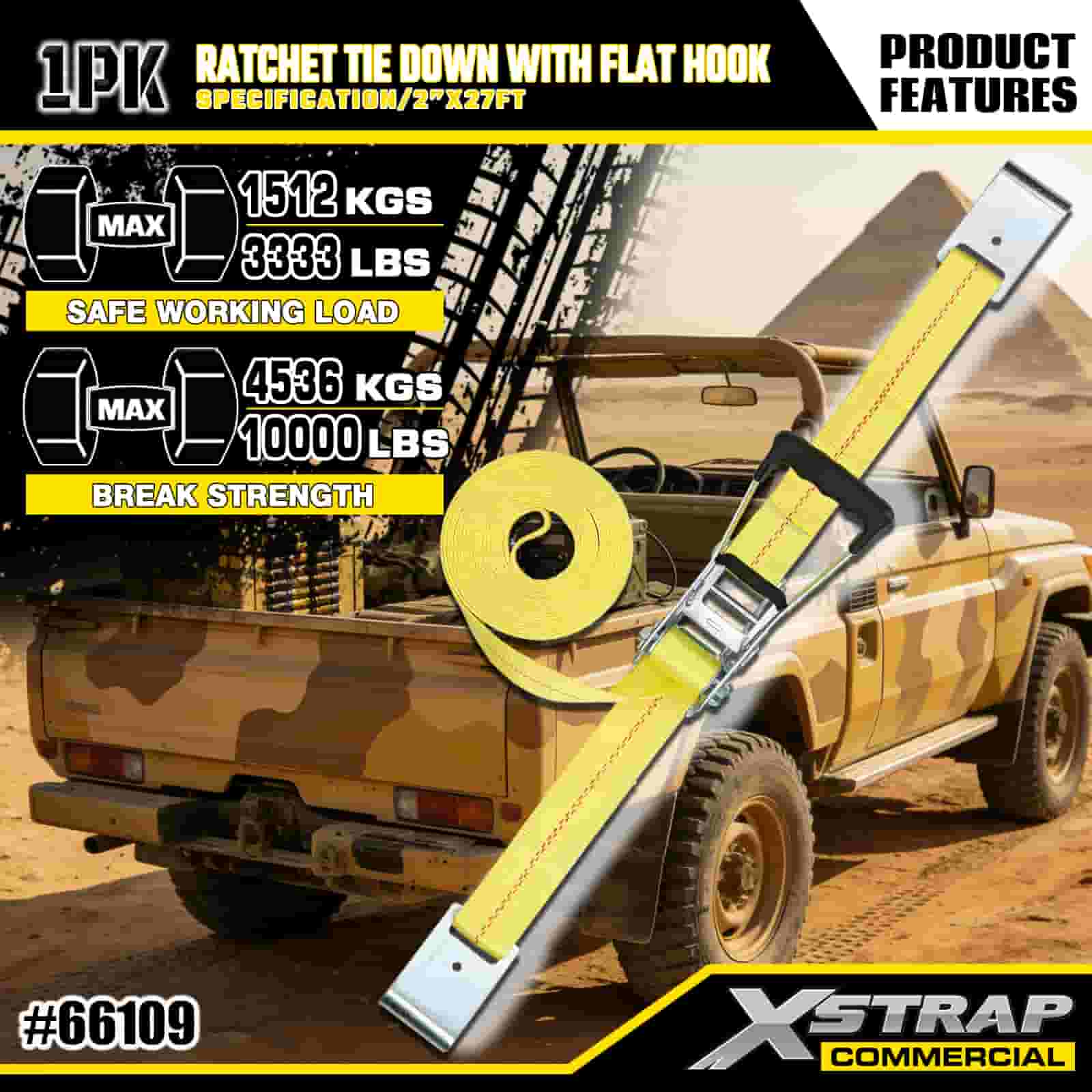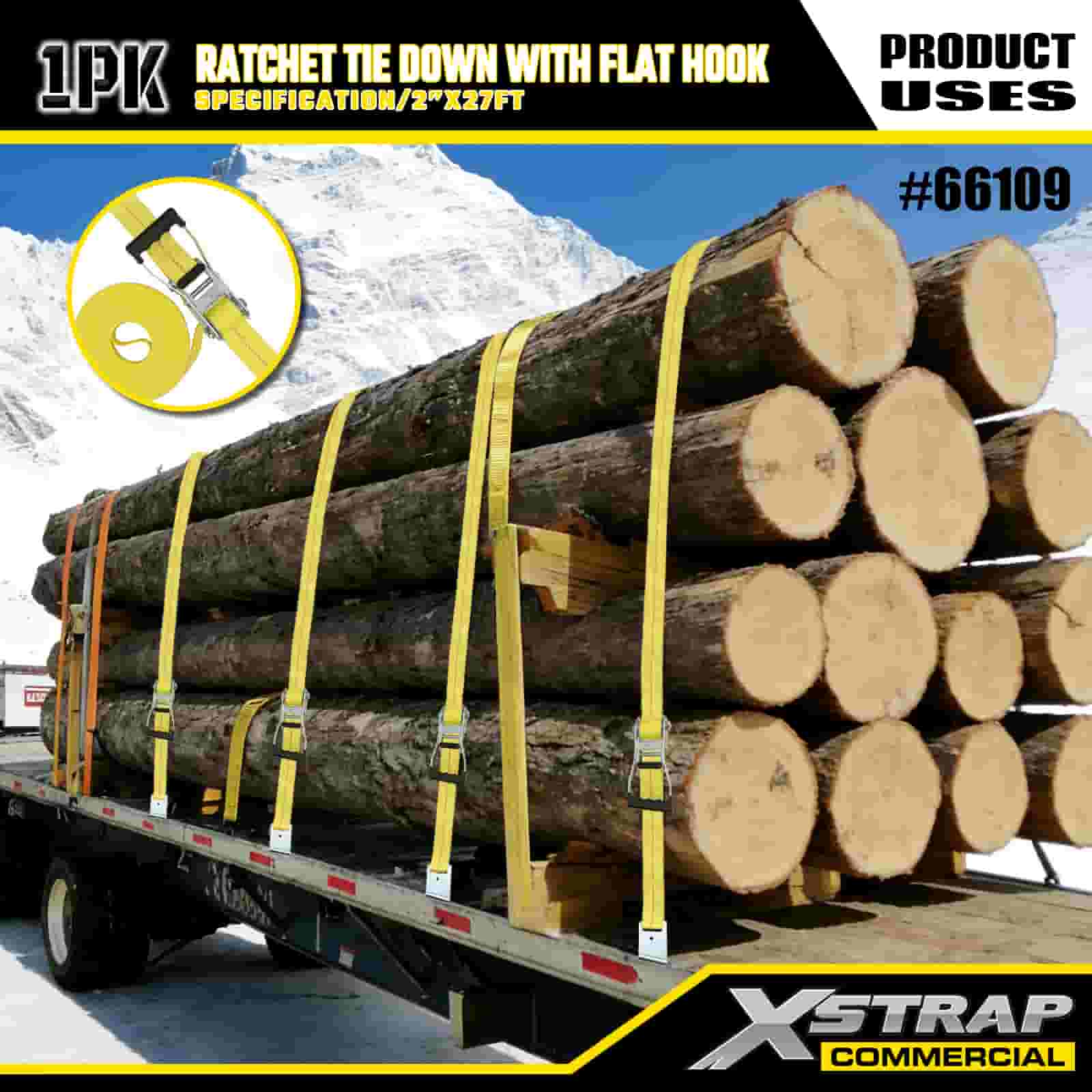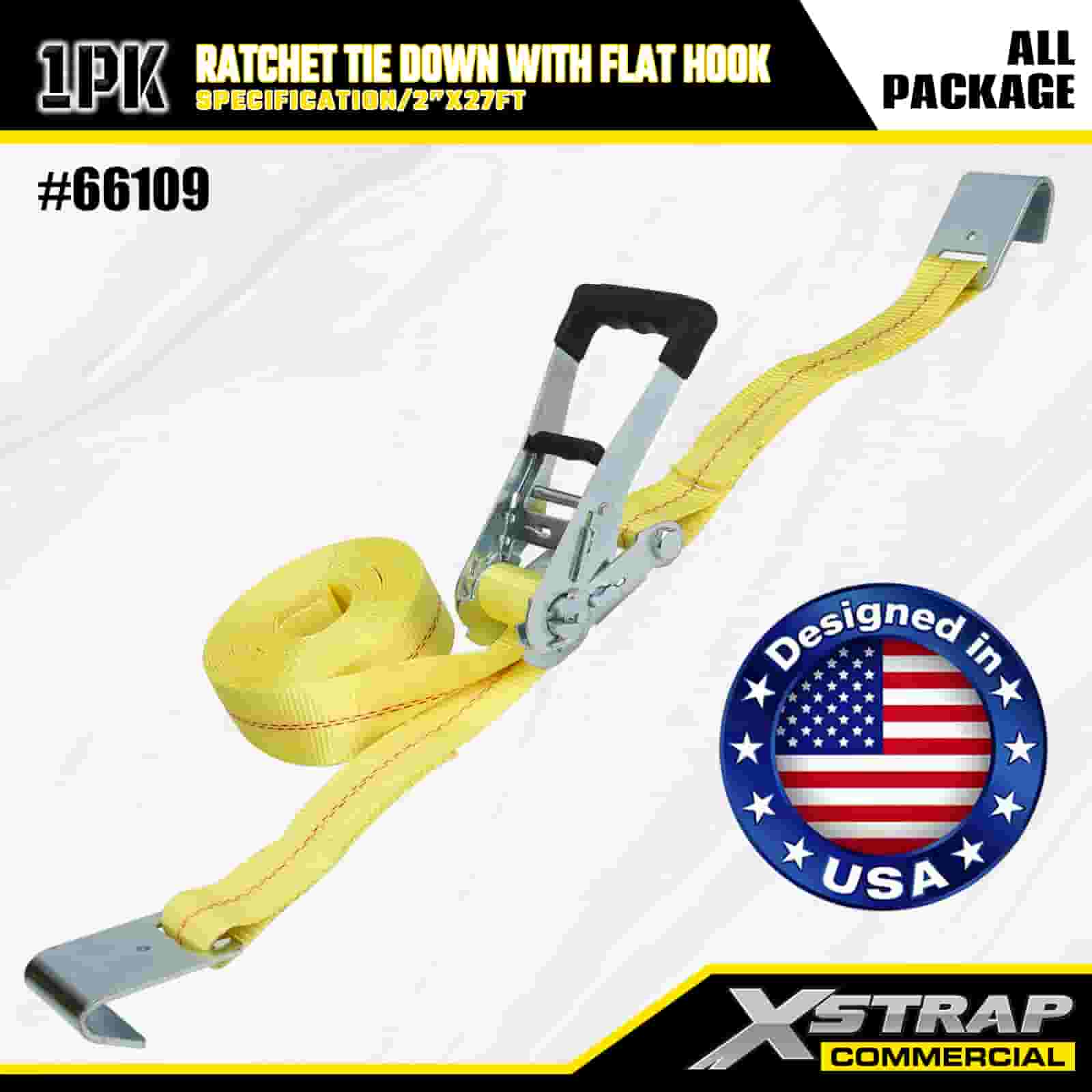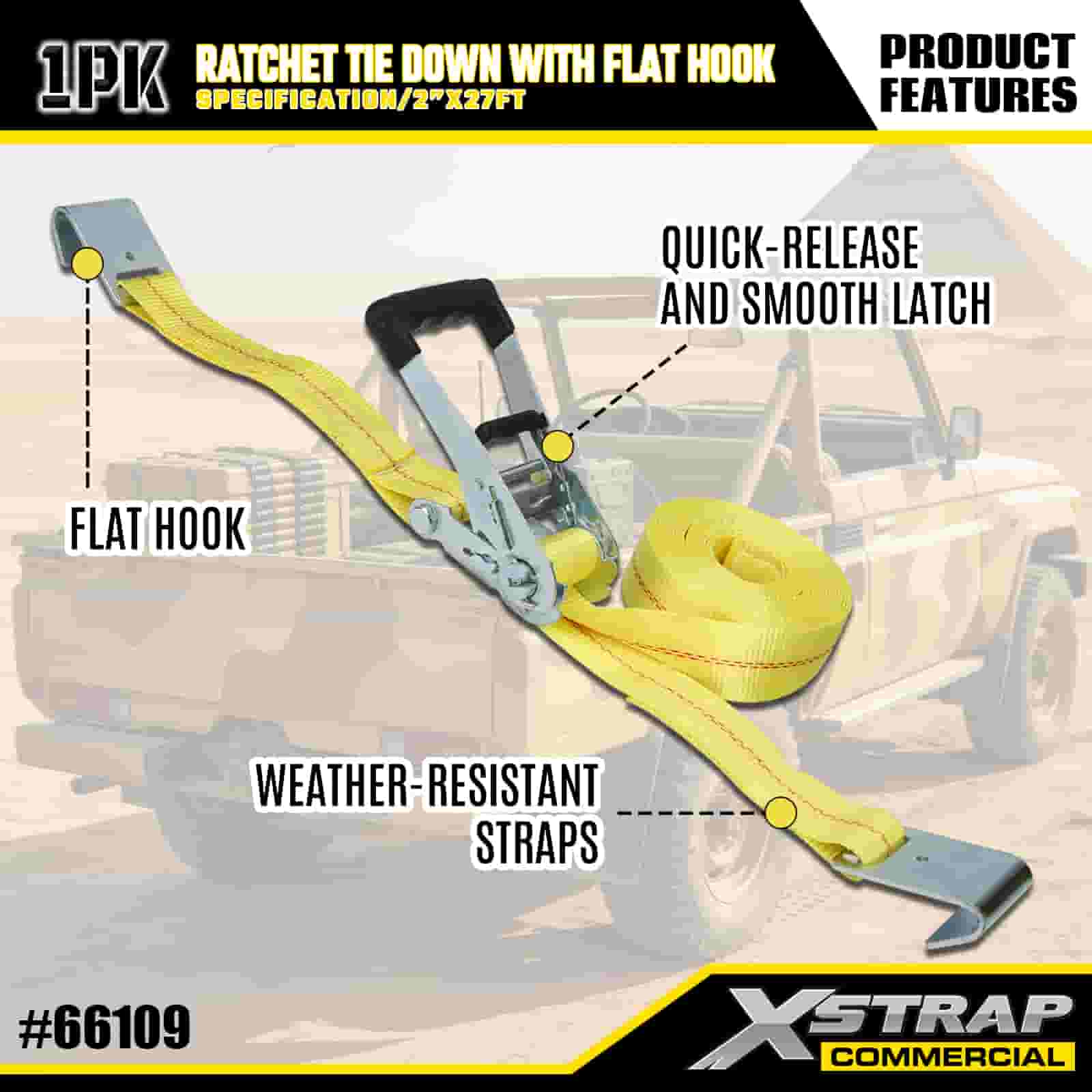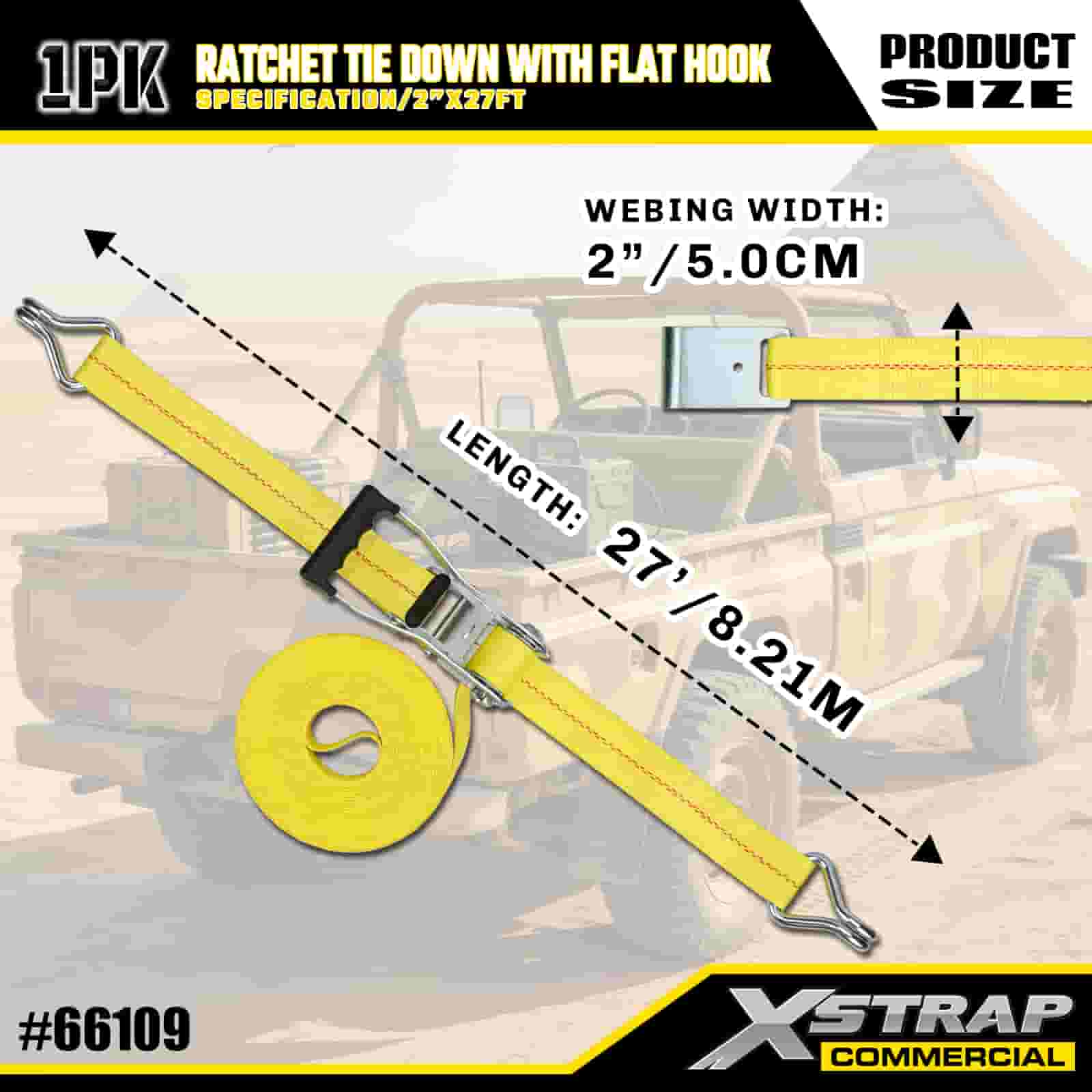 Xstrap ラチェット フラット フック付きタイダウン、2 インチ x 27 フィート ポリエステル タイダウン ストラップ プル ラチェット ストラップ、耐荷重 3333 ポンド、フラット フック付きカーゴ ラッシング固定ストラップ、貨物制御ピックアップ トラック、SUV、車のトップ ラック オートバイなどに使用します。