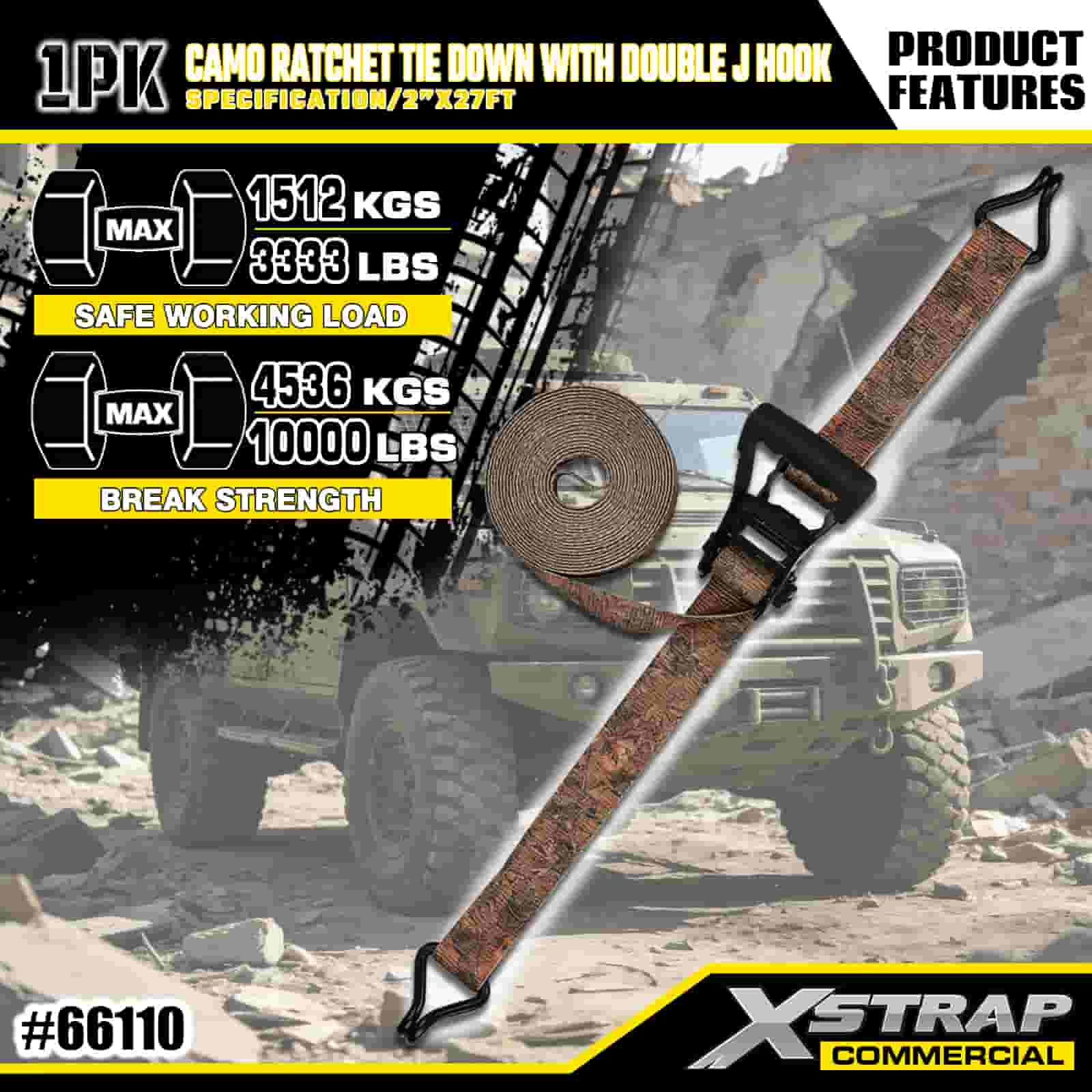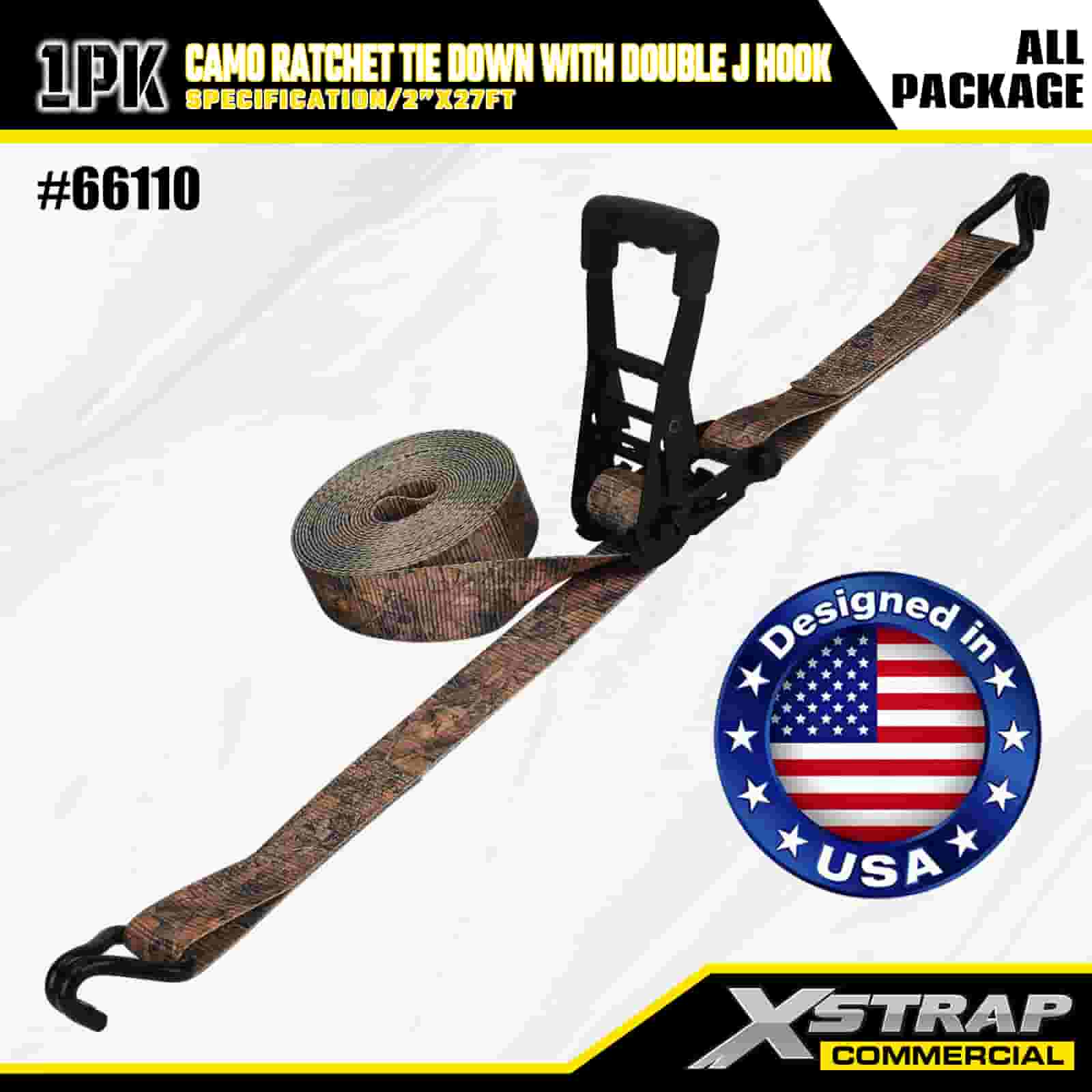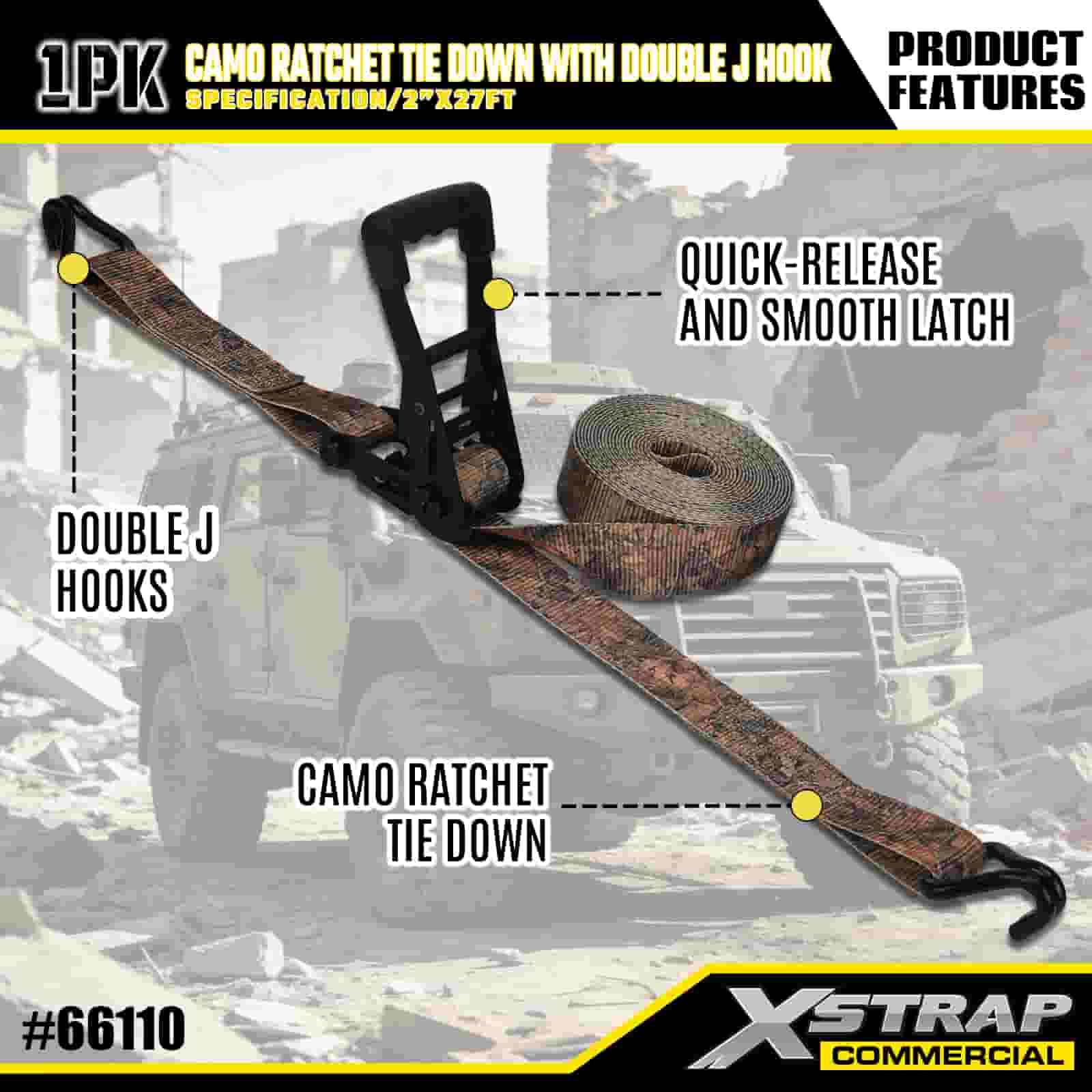 Xstrap CAMO ラチェット タイダウン ダブル J フック付き、2 インチ x 27 フィート ポリエステル タイダウン ストラップ プル ラチェット ストラップ、耐荷重 3333 ポンドのカーゴ ラッシング固定ストラップ ダブル J フック付き、カーゴ コントロール ピックアップ トラック、SUV、カー トップ ラック オートバイ用。