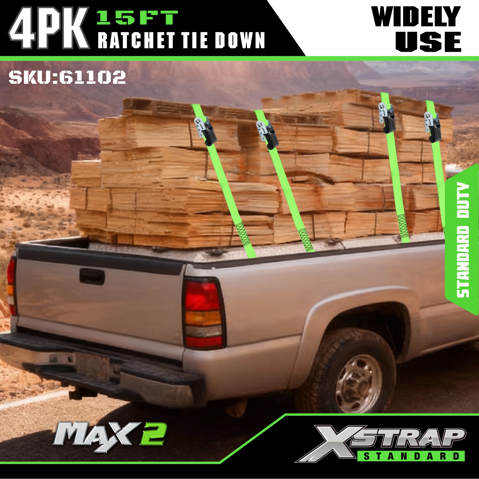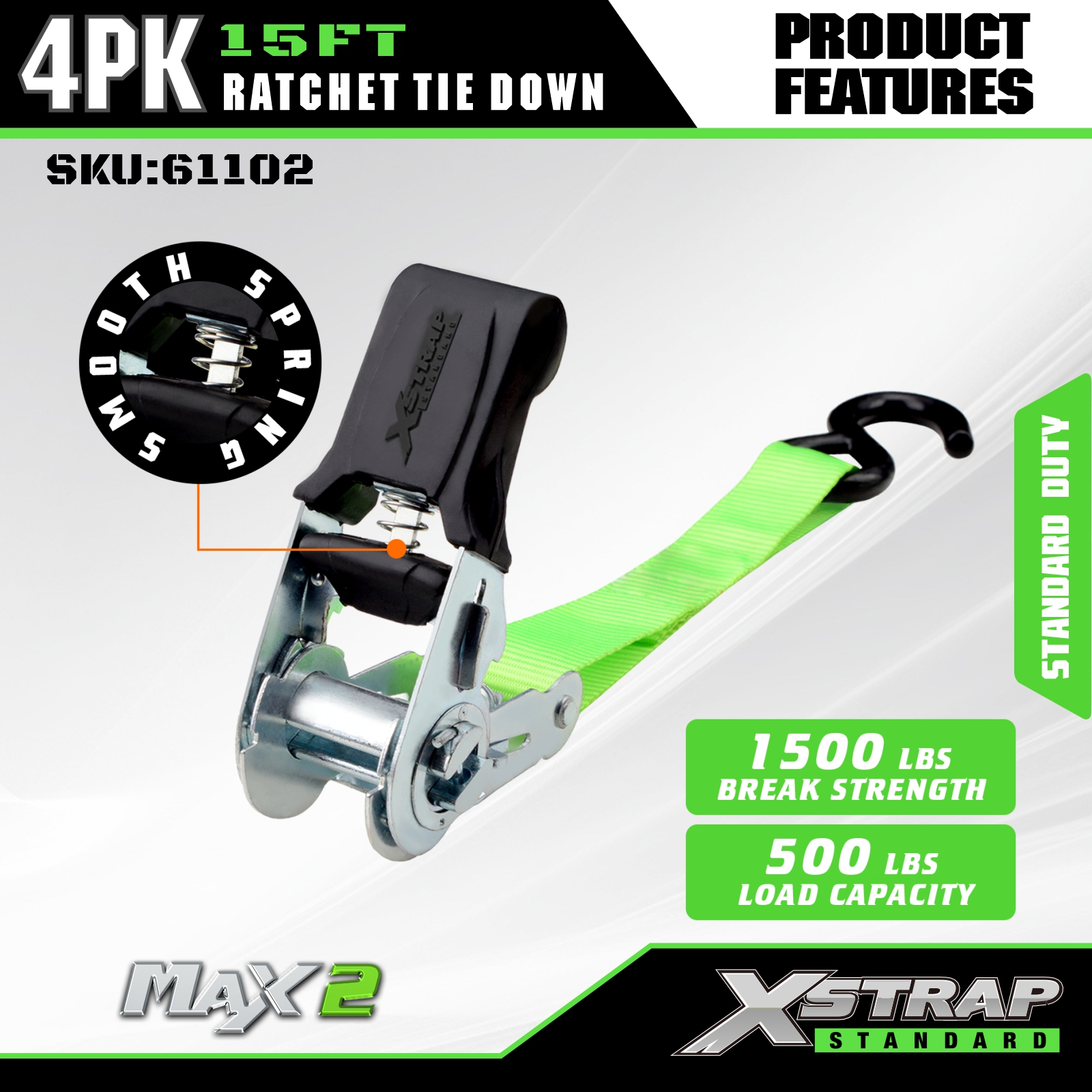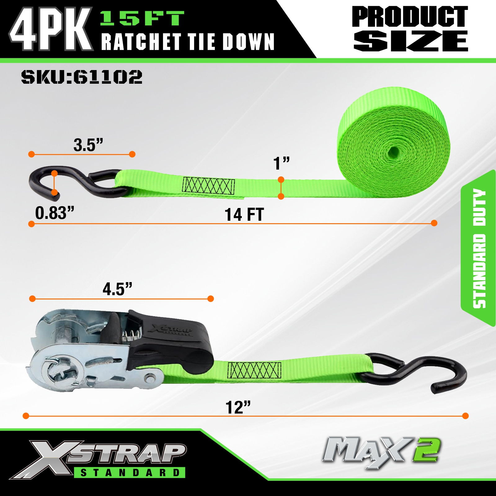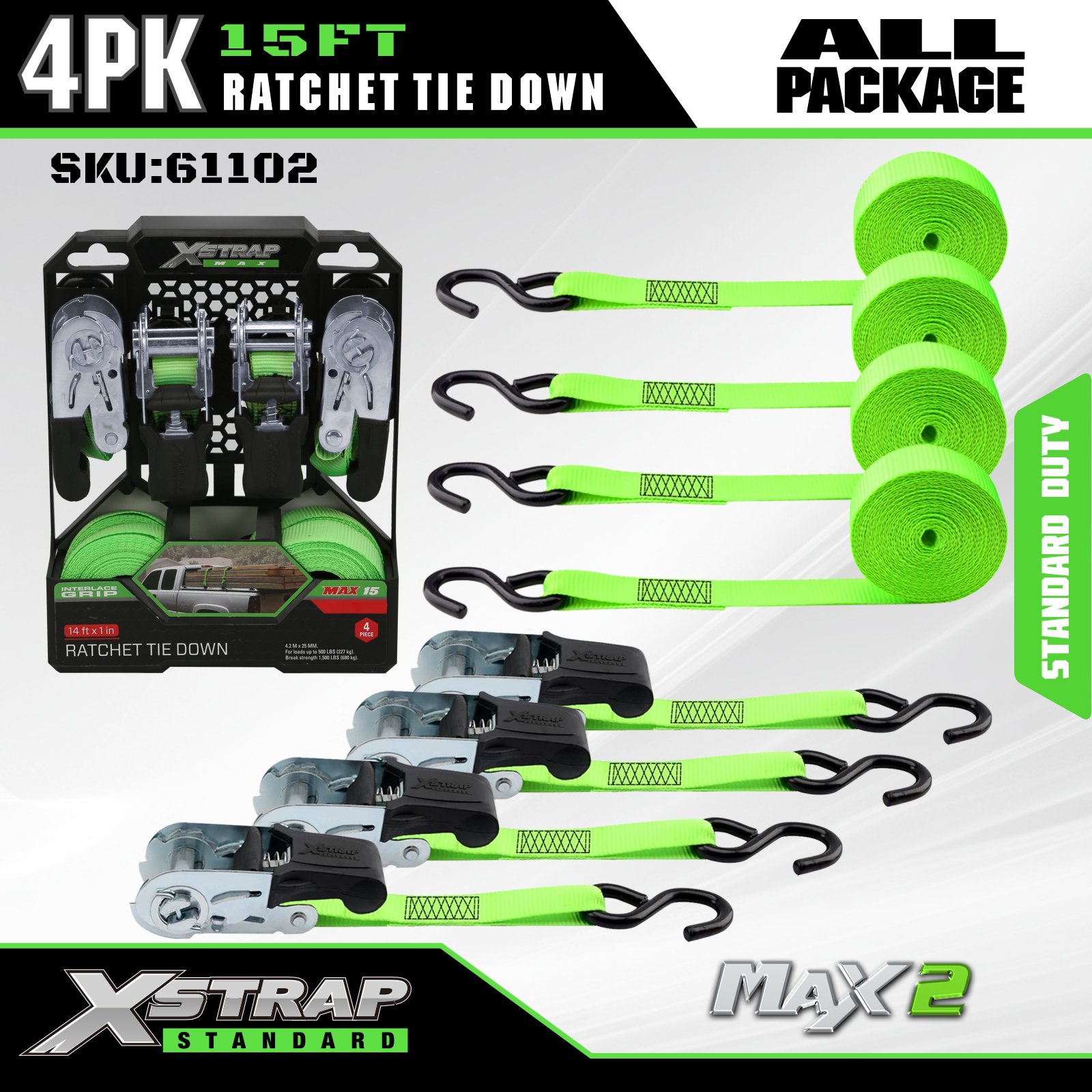 Xstrap ラチェット タイダウン ストラップ 4 PK 15フィート - 耐荷重 500 ポンド、破断強度 1500 ポンド - 移動家電、芝生機器、オートバイ用のカーゴストラップ。