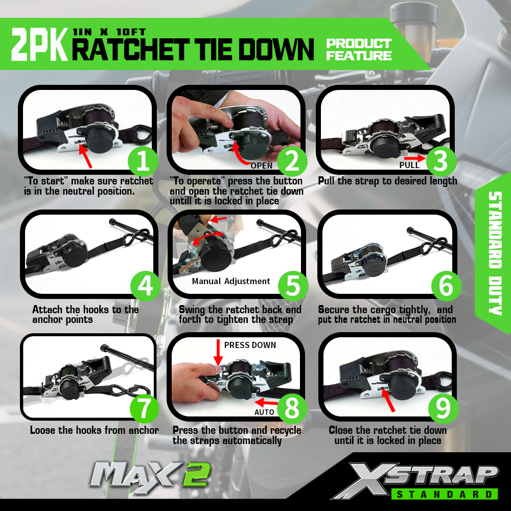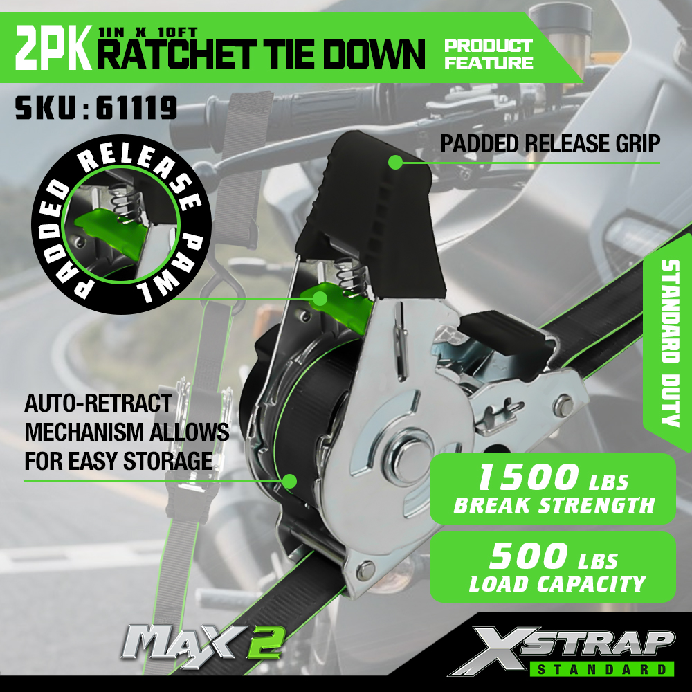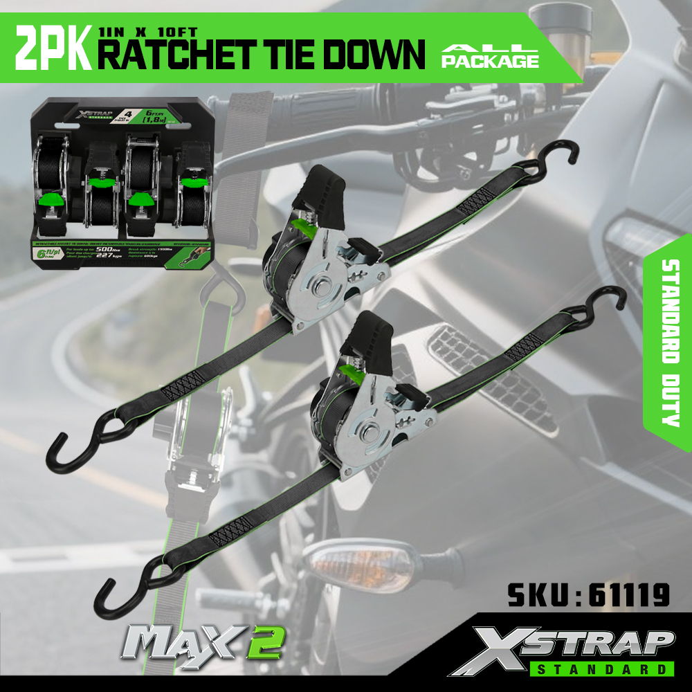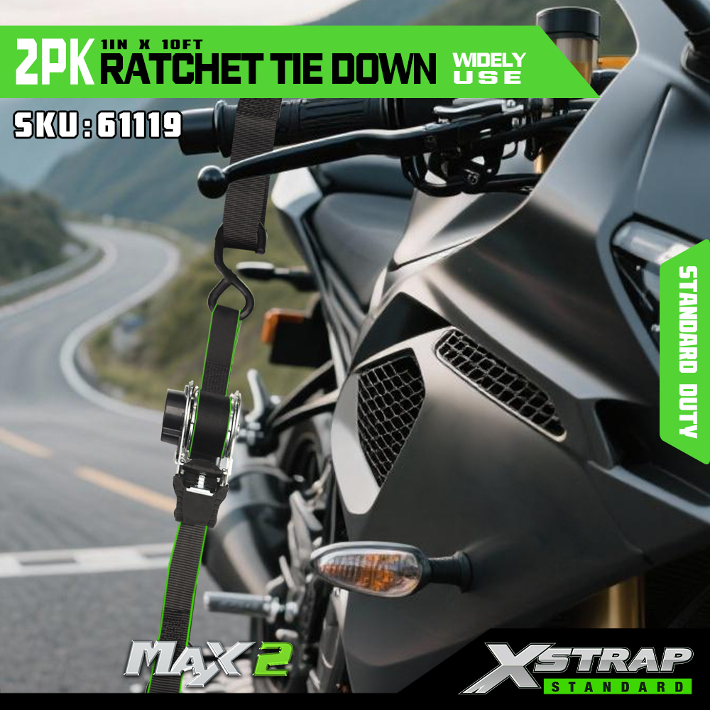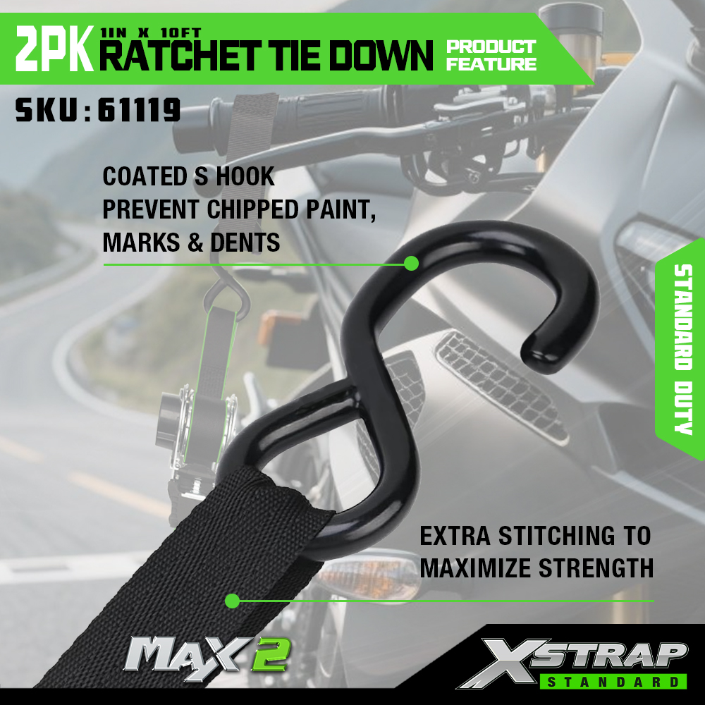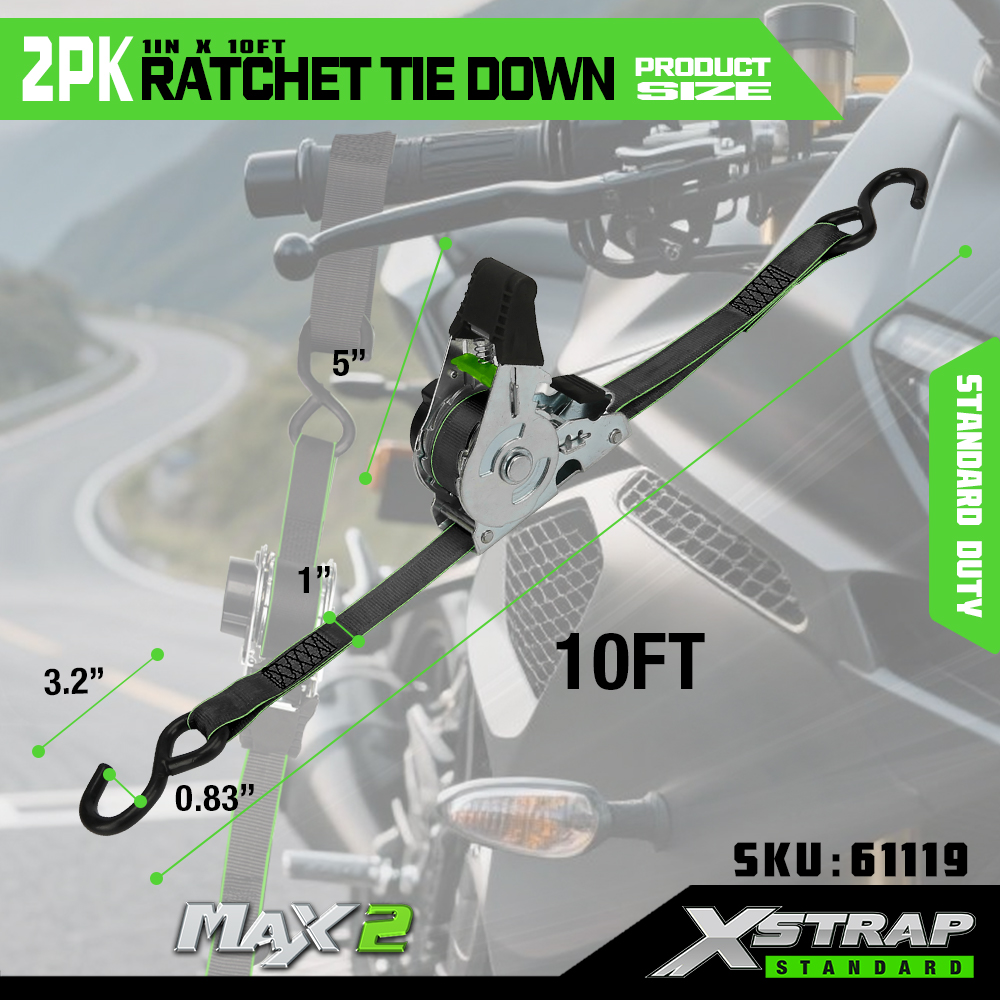 Xstrap 2パック ラチェット タイダウン、1インチ x 10フィート ポリエステル タイダウン ストラップ プル ラチェット ストラップ、Sフック付き耐荷重500ポンドのカーゴラッシング固定ストラップ、ピックアップトラック、SUV、車のトップラックオートバイ、軽漁船、ジェットスキー、スノーモービル、芝生トラクター用。