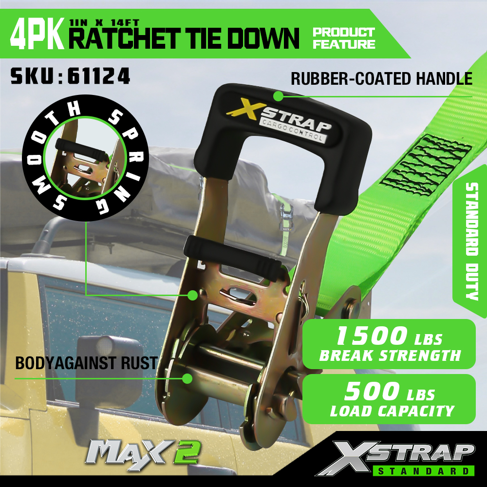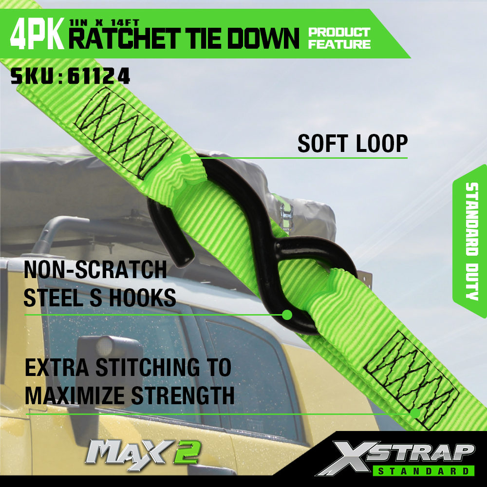 Xstrap タイダウンラチェットストラップ 4 個パック、1 インチ x 14 フィートのポリエステル製ラチェットタイダウンストラップ、ソフトループ付き、容量 1500 ポンド (500 ポンド) の貨物ラッシング固定ストラップ、金属ラチェットと S フック付き、貨物、トラック、芝刈り機、ATV 用。