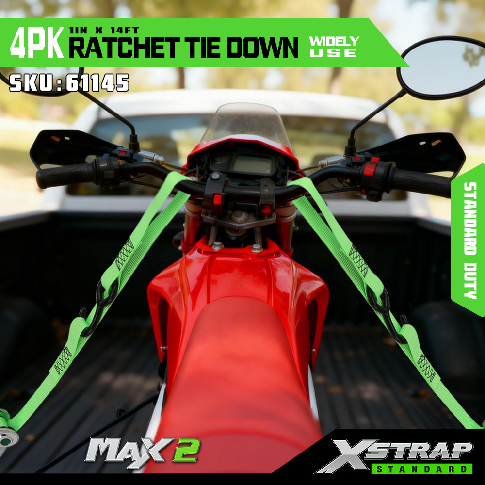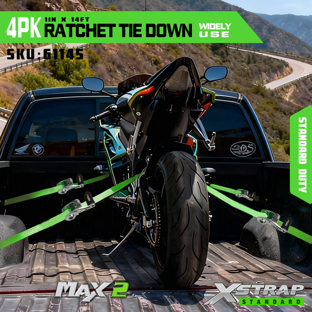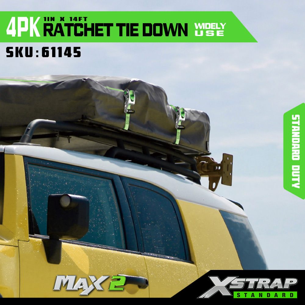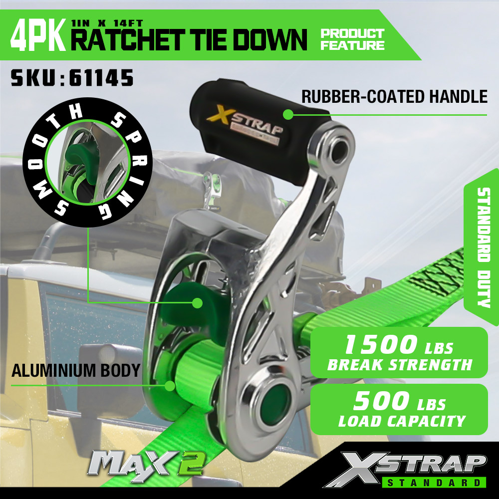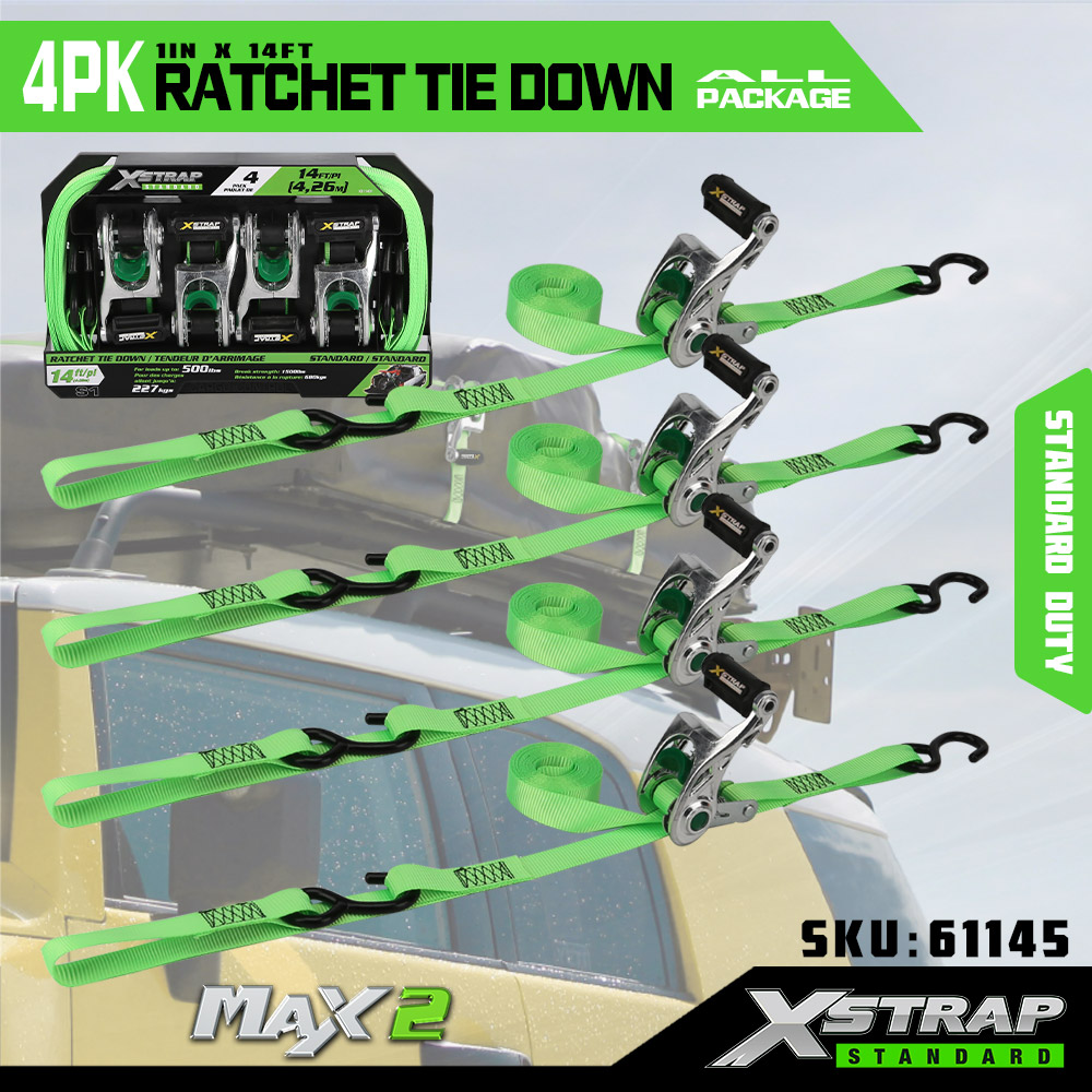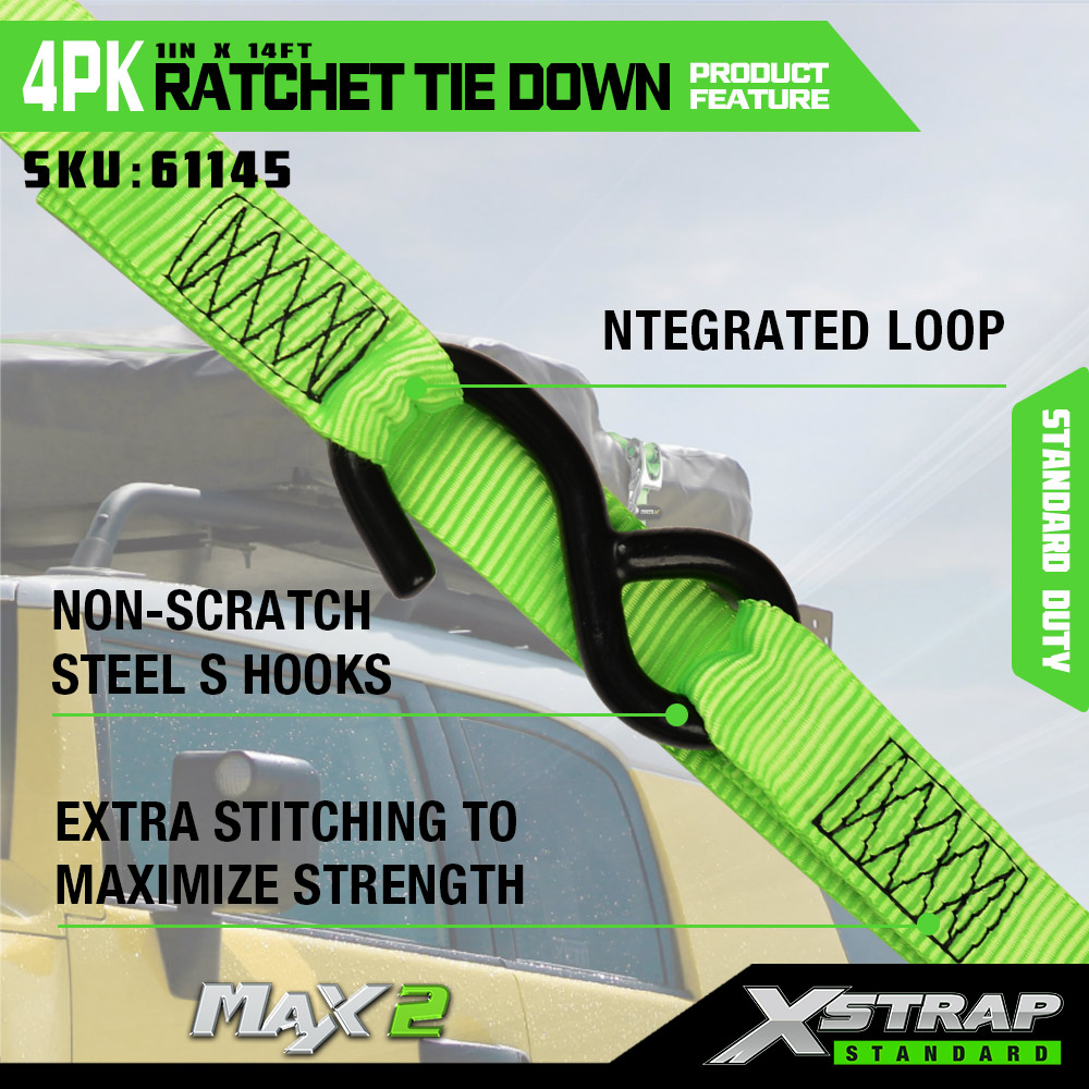 Xstrap 4パック ラチェットタイダウン ソフトループ付き、1インチ x 14フィート ポリエステルタイダウンストラップ プルラチェットストラップ、容量1000ポンド、Sフック付きカーゴラッシング固定ストラップ、トラック、SUV、車のトップラックオートバイ用。